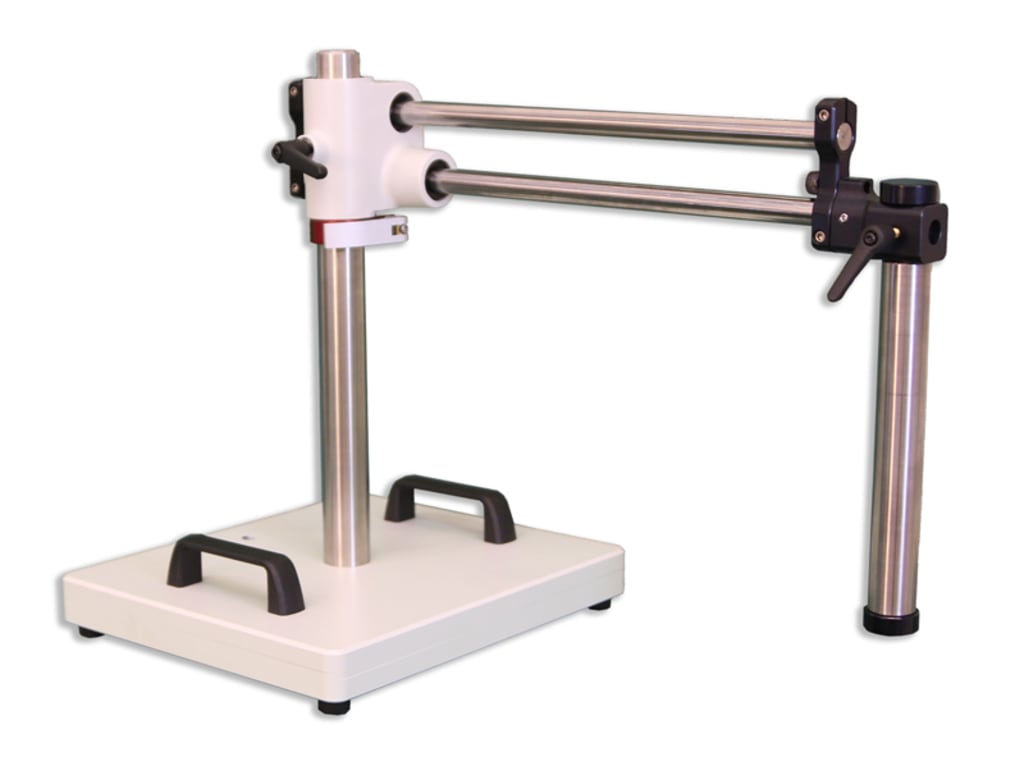 The BAS-1 heavy duty dual arm industrial-type boom stand comes with a 32mm diameter drop down mounting post to perfectly complement our RZ Series Stereo Microscope. The BAS-1 provides complete flexibility for smooth horizontal and vertical movement and adjustment. The BAS-1 uses linear ball bearings to support the horizontal arm, allowing it to glide over the work surface with none of the binding inherent in other boom stands. It is now possible to scan a large flat area, such as a printed circuit board, by simply guiding the microscope with your hands. This is best made heavy Duty Boom stand from U.S.A. There is zero friction motion from precision roller bearings machined into cast housings along with a sturdy solid 80 lbs. metal 13 inch x 13 inch x 1.5 inch base with heavy duty rubber feet and ergonomic handles provides an excellent solution for heavy duty and industrial applications requiring smooth friction free travel.