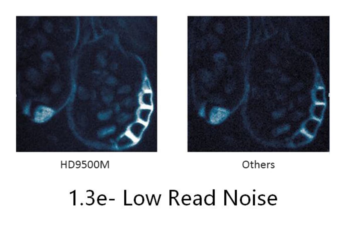 This increase in quantum efficiency over existing sensors further improves the absolute response threshold of HD9500M to 1.3 photons, making it the most sensitive sCMOS camera in the world. The HD9500M has a powerful capacity for photon counting.