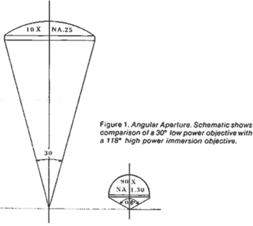 The oil immersion objective of medium angular aperture has more resolving power than a " dry" with larger angular aperture and the term, proposed by Ernst Abbe, "numerical aperture," (N .A.) must be considered. N.A. is equal to n x sin 1/2 A.A. where n is the lowest refractive index in the path. Therefore, the air gap between cover glass and objective gives a theoretical maximum N.A. of 1.00; water, 1.33; immersion oil, 1.515. Since other limitations permit only a practical N.A. of 1.40 with lens glass 1.515, the use of immersion oil permits full use of the resolving power of the objective. And, for a given angular aperture, immersion oil objectives increase the resolution by approximately 50% over dry objectives of equivalent focal length.