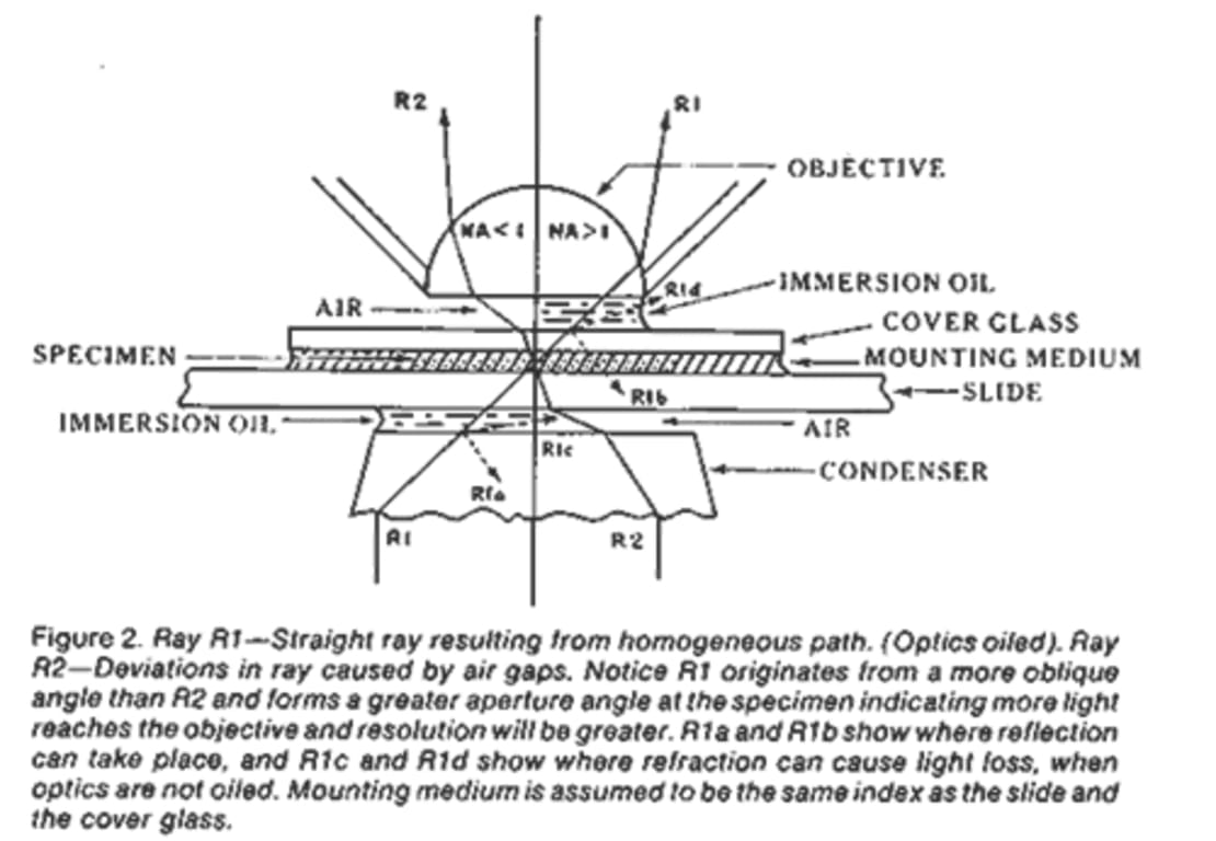 Just as immersion oil permits utilizing the full N.A. (resolving power) of the objective, it is also a necessity for obtaining the maximum N.A. of the condenser. With a condenser N.A. 1.40 and an air gap between the condenser and the bottom of the slide, the limiting value is N.A. 1. (air); The additional light being lost by internal reflection within the condenser.
