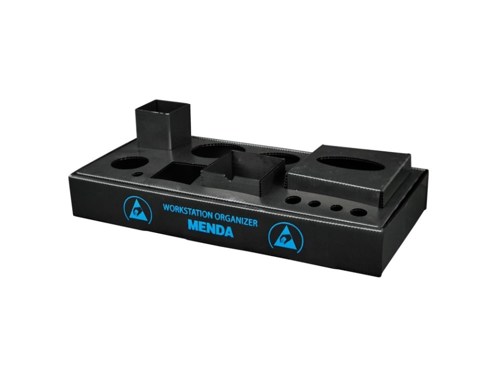 The Menda 35873 is an assembly workstation organizer. It is ideal for improving the appearance of the workstation and standardizing the placement of tools at any workstation. It can be used for various items which are used on the workstation, such as MENDA dispensing bottles, lotion, flux bottles, solder spools, cutters, tweezers, wash bottles, and various other workbench accessories. A conductive material with 1 x 10² to <1 x 10⁵ ohms per ANSI/ESD S11.11 provides a reliable path-to-ground.