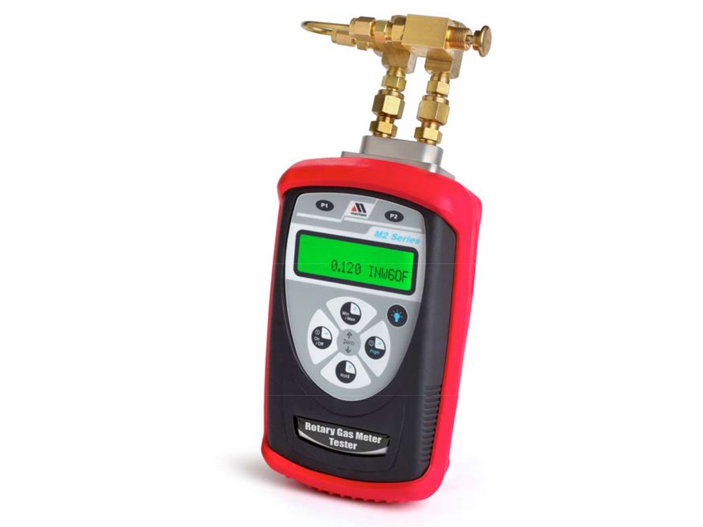 The digital display eliminates parallax errors, and depending on the range of the gauge, it can have a resolution of 0.01 or 0.001” H 2 O. A min/max feature also allows the user to see the minimum and maximum pressures recorded during the test. The unit is portable, and with the integral push to read manifold, the M201 Rotary Gas Meter Tester can safely be used with lines having a static pressure of up to 150 PSIG.
