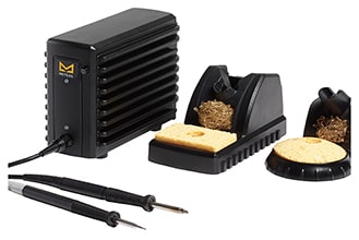 The Metcal MFR-1100 is a powerful, cost-effective system with a variety of options and accessories to meet nearly any application. The MFR-1100 power supply has a powerful 60W output, and can be used with several different handpieces, including a desoldering option. Compatible with hundreds of tips and nozzles, the MFR-1100 is extremely versatile and suited for use in demanding environments. The MFR-1100 series uses SmartHeat Technology, a microprocessor controlled heating system which operates at lower temperatures and eliminates calibration time. The tip temperature is determined by the inherent metallurgical properties of the heater; no external adjustment or equipment is required. The power delivered to the tip automatically varies in direct response to the thermal load. This eliminates spikes and transients associated with electrically switched elements found in conventional soldering irons. Versatile and compact, the Metcal MFR-1100 is a great choice for a soldering system with a small footprint. The Metcal MFR-1100 is offered in several different packages. The chart below provides an overview of what is included with each: