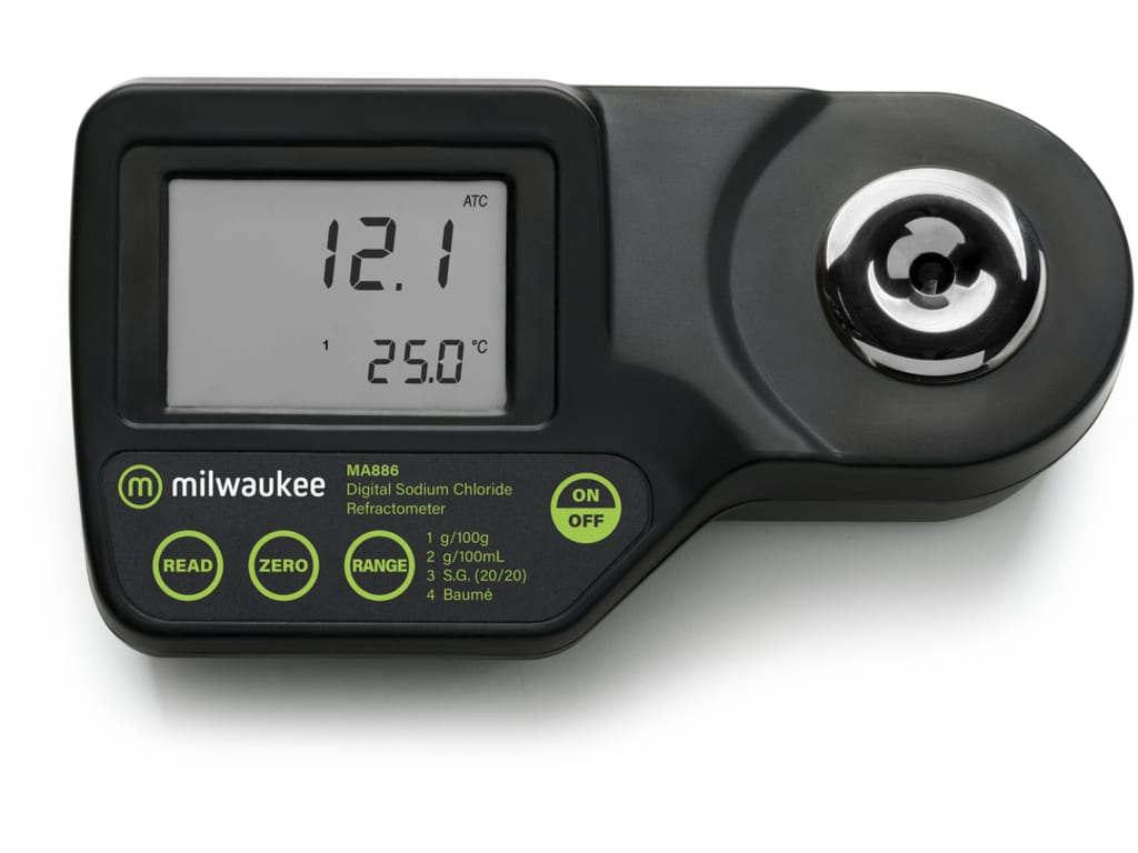 The MA886 digital refractometer uses the refractive index to determine sodium chloride concentration in aqueous solutions used in food preparation. The MA886 is not designed for measuring salinity in sea or aquarium water. Use MA887 for this application.