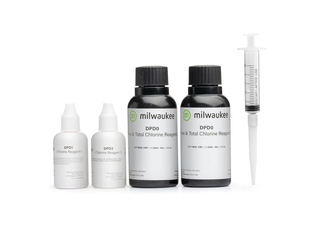 The MI513-045 High Range Free & Total Chlorine liquid reagent kit includes high-quality reagents that are ready-to-use with Milwaukee's Free & Total Chlorine Meter MI413. The reagents use the DPD Method with a reaction between chlorine and reagent causing a pink tint in the sample. Simply add the reagent to the sample, wait for the reaction to take place and the photometer determines the concentration based on the color. The reagents are designed for use with samples that have an expected range of 0.00 to 10.00 ppm (mg/L) High Range Free & Total Chlorine.