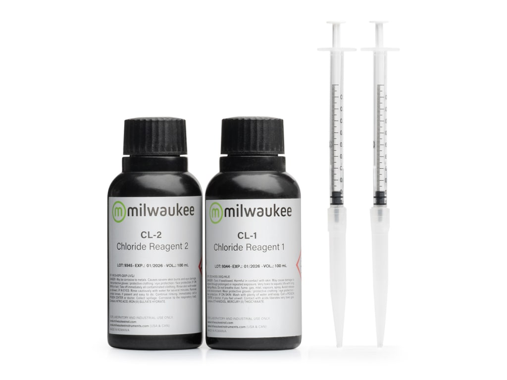 The MI514-100 Chloride liquid reagent kit includes high-quality reagents that are ready-to-use with Milwaukee's Chloride Meter MI414. The reagents use the adaptation of mercury (ll) thiocyanate method. Simply add the reagent to the sample, wait for the reaction to take place and the photometer determines the concentration based on the color. The reagents are designed for use with samples that have an expected range of 0.00 to 20.00 ppm (mg/L) (Cl).