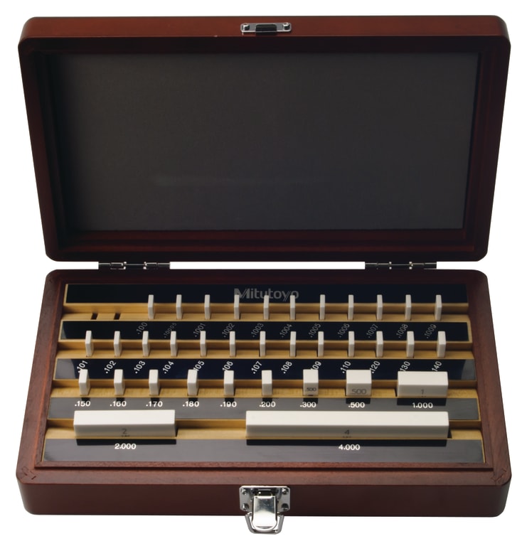 The Mitutoyo Micrometer Inspection Gage Block set was designed specifically for micrometer inspection. The Mitutoyo Micrometer Inspection Gage Block set is used to inspect a variety of micrometers with high accuracy. These gage blocks can be stacked for either horizontal or vertical measurements. The Mitutoyo steel gage blocks are constructed of high-carbon, high-chrome steel while the CERA gage blocks are constructed of ceramic materials with superior surface qualities and corrosion resistance. Parallelism can be measured by attaching the optional optical parallel to the gage block set.