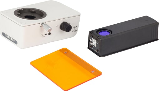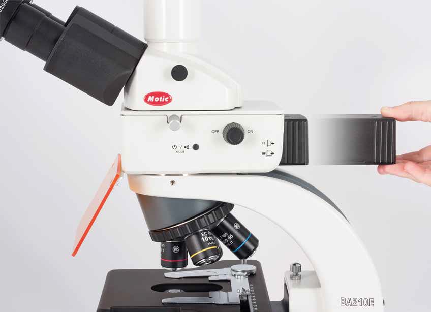 Motic's Epi-LED S is an LED Fluorescence intermediate module specially designed for the BA210E. It consists of a 3W LED light source, combined with a suitable filter combination. The module is placed as an add-on between microscope stand and eyepiece tube. A fast change from Bright field to Fluorescence and vice versa is possible by moving the LED module back and forth. A change in excitation is possible by simply exchanging the compact illumination module. The integrated IR-sensor detects the user and turns off the Fluorescence automatically when the microscope is left, again taking young users into consideration.