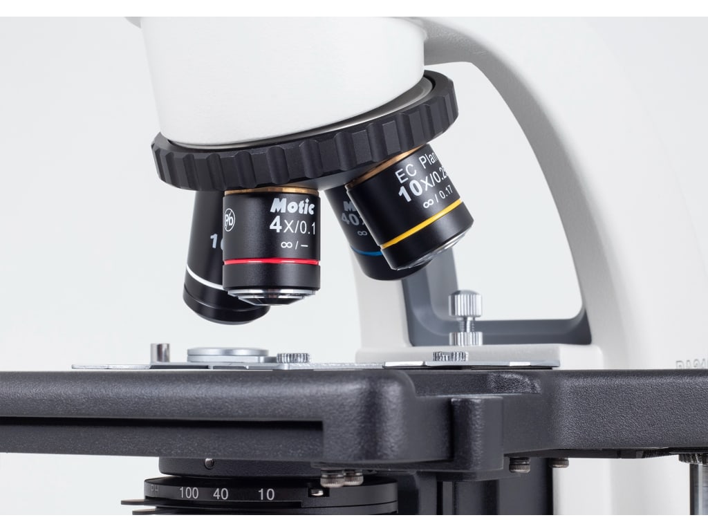 This version of the Motic BA210E is a microscope with a binocular head and EC PL 4x, 10x, 40x S objectives for basic work in the life sciences of biology and medicine. The BA210E series is designed for ease of use and longevity and features robust mechanics combined with improved optical performance for the student level. The rackless stage without a prominent gear rack enables a safe x/y scanning, especially for unexperienced users. The extended stage pole allows a simultaneous right-hand fine focusing.