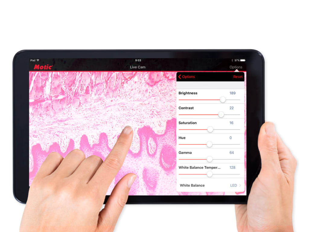 The Moticam 1080X delivers clear, crisp HD live imagery to an HDMI screen. Still, images and videos can be saved to an SD card via the built-in SD card slot. Connect a USB mouse to control image parameters and still or video capture modes with the built-in software.