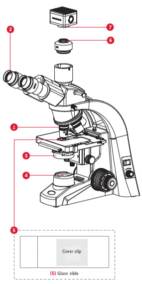 Dust cover, power cord, Allen key, blue filter, halogen bulb, LED module, adjustable key for nosepiece, interference color chart, screws for metal extension support |