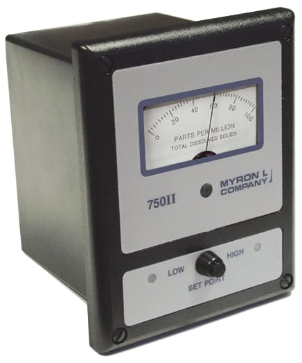 The unique circuitry of the 750 Series II Conductivity Monitor/Controllers guarantees accurate and reliable measurements. Drift-free performance is assured by “field proven” electronics, including automatic DC offset compensation and highly accurate drive voltage. Since temperature compensation is at the heart of accurate water measurement, all Myron L® Monitor/controllers feature a highly refined and precise TC circuit. This feature perfectly matches the water temperature coefficient as it changes. All models corrected to 25°C. The TC may be disabled to conform with USP requirements. Built-in electronic calibration allows for fast quality checks without standard solutions. (Note: for maximum system accuracy standard solutions are recommended). A push-to-test button makes setpoint checks easy, while the internal alarm set discourages unauthorized adjustments. Standard on all controller models is a heavy-duty 10 amp output relay, operating on either increasing or decreasing readings. Bright green/red LEDs indicate above or below setpoint readings. All 750 Series II models feature an IP65/ NEMA 4X water resistant and corrosion-proof rated enclosure. Compact in size at 152 x 122 mm/6 x 4.8 in., they are suitable for panel, bench or surface mounting. Additional options include a 3 Sensor Input Switch and/or a 3 Range Switch and a Remote Alarm™ model RA.