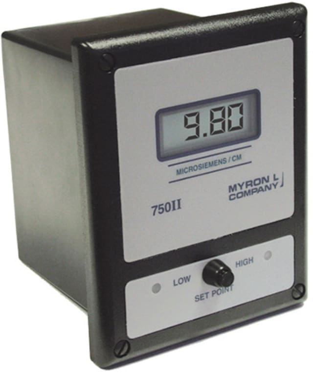 The unique circuitry of the 750 Series II Conductivity Monitor/controllers guarantees accurate and reliable measurements. Drift-free performance is assured by field-proven electronics, including automatic DC offset compensation and highly accurate drive voltage. Since temperature compensation is at the heart of accurate water measurement, all Myron L Monitor/controllers feature a highly refined and precise TC circuit. This feature perfectly matches the water temperature coefficient as it changes. All models were corrected to 25°C. The TC may be disabled to conform with USP requirements.