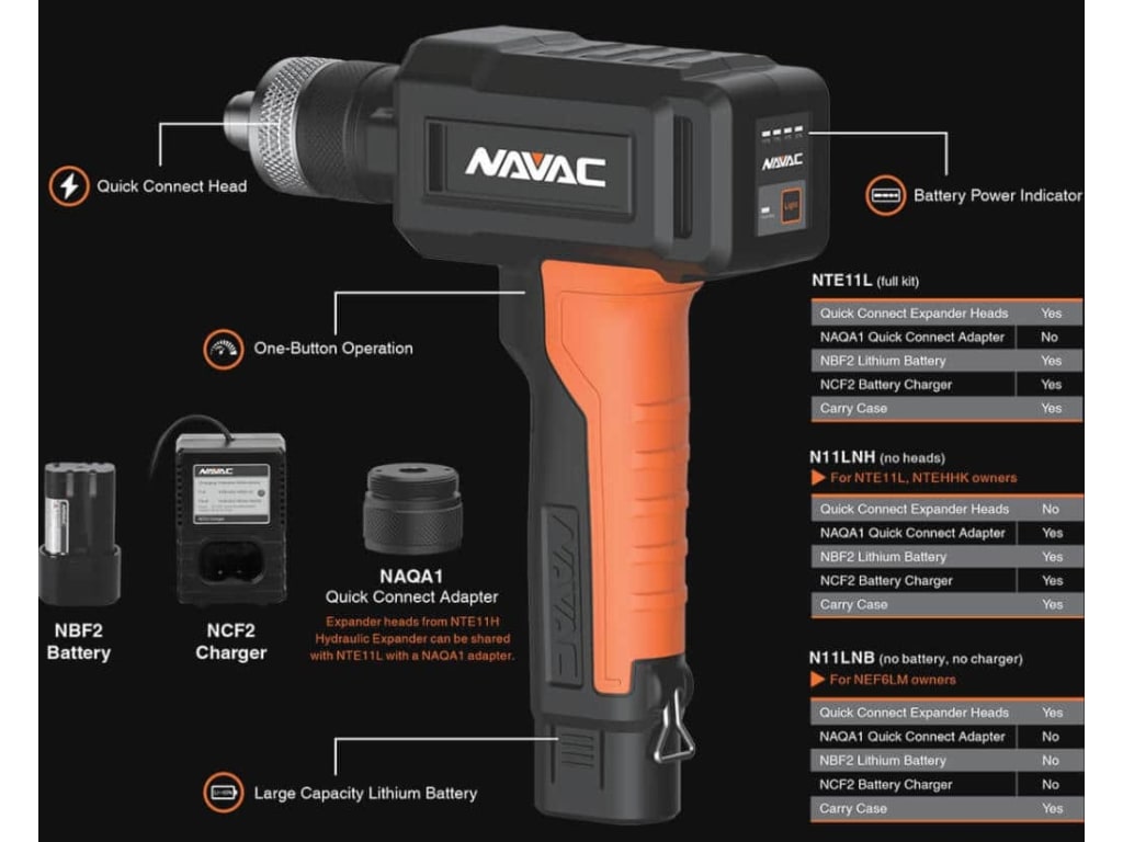 The battery and charger are com[partible with NAVAC NEF6LM BreakFree Power Flaring Tool. Expander heads from the NTE11H Hydraulic Expander can be shared with NTE11L with a NAQA1 adapter. The NTE11L Kit is available in packages without expander heads or batteries.
