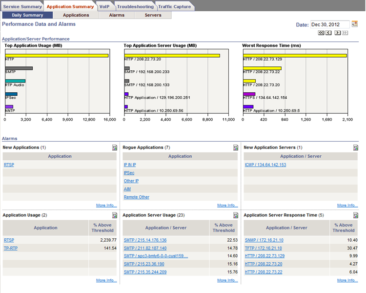 Select AppsIntegrity dynamically auto discovery applications, giving you a total view of application utilization across your network. A Web-based, graphical interface provides visibility into the applications used over the past four weeks and allows you to see new applications running on your network. Such detailed data helps you properly troubleshoot and manage your entire infrastructure (from Layers 1-7) and minimize potential problems that could degrade application performance.