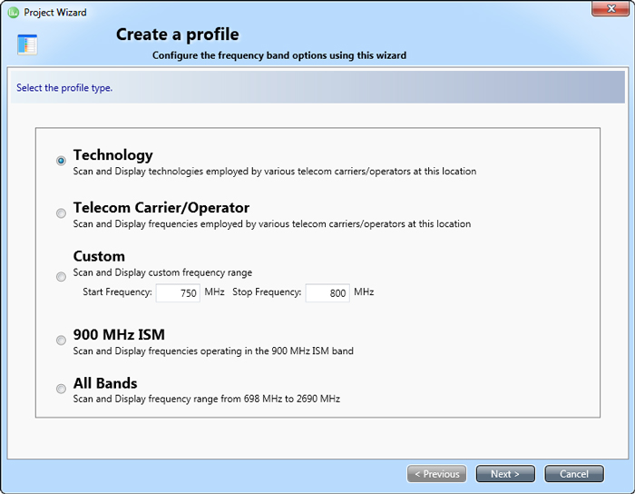 As AirMagnet Spectrum ES can also operate as a general purpose spectrum analyzer, users can use the custom frequency profile option to select any frequency range between 698 MHz to 2690 MHz to scan RF energy for their specialized applications.