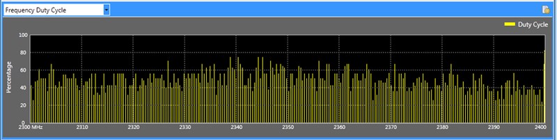 The Duty Cycle graph displays how often an interfering signal is present in a particular frequency range. A high duty cycle could mean an interferer is constantly transmitting and will most certainly cause problems in that frequency range.