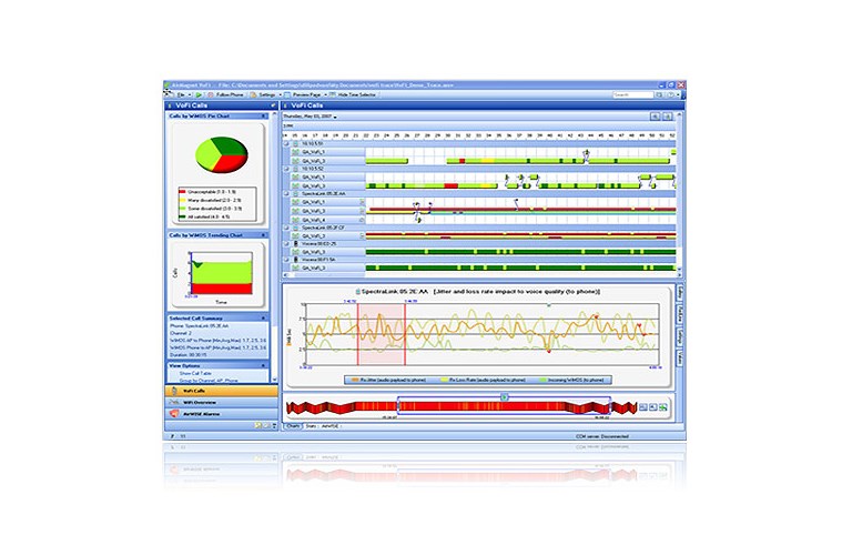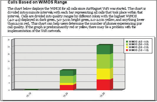 AirMagnet VoFi Analyzer displays your network in terms of calls and call quality. AirMagnet's patent-pending technology scans all 802.11a/b/g devices, distinguishes between voice and data traffic, and automatically scores every call in terms of WiR-Value and WiMOS Score based on a variety of packet metrics, such as loss rate and jitter. The solution independently scores and tracks both sides of a call (AP to phone and phone to AP), allowing users to distinguish problems that are rooted on one side of the call. Each call is color-coded according to call quality, making it easy to visualize phones or calls with problems. This provides a full history of all calls on the network, and quickly reveals problems that are tied to a particular phone, channel or a given period in time.