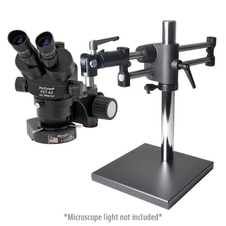 The ProZoom® family outperforms stereo microscopes costing twice as much. ProZoom 6.5 provides the largest standard working distance, the largest magnification range and the largest eyepieces available on a modern stereo microscope. ProZoom® 6.5 Trinocular Microscope featuring Super-Wide (28mm) 10x Eyepieces. Standard Magnification Range of 5 – 65x (up to 390x with options). 0.3x CCD Camera Adapter. This package does not include a camera or screen. It is designed for customers who wish to build in the ability to add a camera at a later date. Heavy Duty Ball Bearing Base Included. Compatible with all Micro-Lite® Illuminators. (Shown with the optional Micro-Lite® LV2000-B). ESD Safe