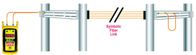 BOLT stands for Beaming Optical Length Tester, and offers a unique, low-cost alternative for users who need to measure the length of optical fibers. Fiber installations are increasingly required to have fiber length measurements to comply with bid requirements. Rather than purchase certification test sets that can cost thousands of dollars, the BOLT-NL can be added to an installer’s existing fiber test kit. These length testers use a “round-robin” method of measuring fiber length. This is accomplished by looping back two fibers at one end of the fiber run with a patch cord. The round trip time that the light takes to travel through both fibers is converted to length in kilometers, then divided by two to show the length of the fiber cable. There is no need to measure the length of all the fibers; the length measurement can be applied to all fibers in the cable. This method of length testing provides accurate measurements, and saves time and money. Measuring fiber by the jacket is an accepted method of measurement; however, there are many scenarios where this may not be valid. Length markings may be hard to reach if they are already terminated in a patch panel. Fiber links may also go through multiple cross-connects or have splices in the middle, thereby making jacket markings invalid. Optical measurement of fiber produces accurate results without the need for jacket markings. Optical measurement also saves time by eliminating the need to estimate the length of the fiber run with a measuring wheel. This method is especially troublesome and inaccurate in networks that traverse walls, are in a star topology, or contain riser cables. The BOLT uses a 1310nm infrared laser that can measure fiber links of up to 25 kilometers, is accurate to within ±2.5 meters, and pulsing mode allows for easy fiber location when used with a fiber identifier. NOTE: To avoid confusion, the BOLT-NL is NOT designed to measure distance to a fault like an OTDR. The BOLT-NL is designed to measure the end-to-end length of a fiber cable. A pair of terminated fibers, looped back at the far end of the cable, are required for end-to-end fiber cable length measurement (see diagram below).