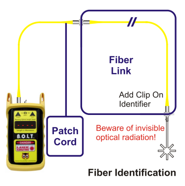 Fiber Identification. The BOLT-NL provides a pulsed mode for easy fiber identification. Fibers are identified by clamping a fiber identifier onto a jacketed fiber, which produces a tone to indicate presence of a signal. This is useful for locating fibers that are marked incorrectly or not marked at all. Connect the BOLT-NL to the fiber you are testing via a patch cord as shown at right. Power on the BOLT-NL into fiber identification mode by flipping the switch to TEST. This mode emits a flashing beam of invisible light into the fiber. Identify the fiber by clamping a fiber identifier to the fibers until you locate the fiber being tested. Many identifiers produce an audible tone.