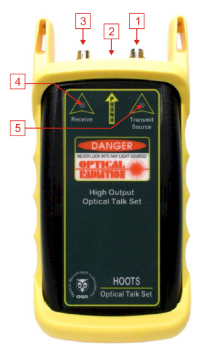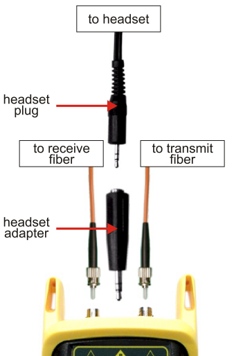 You will need a pair of fibers terminated into a connector at both ends of the link in order to use the HOOTS. Connect to the transmit and receive fibers to the talk set connectors (as shown in the figure at right). The other end must have its fibers connected opposite to the other, i.e. the transmit fiber on one end is the receive fiber on the other. Connect the headset plug to the headset adapter, then plug the headset adapter into the headset jack on the HOOTS. If the fibers are connected correctly, then both the Transmit and Receiver LEDs will light, and communications can begin. If the LEDs are not lit, double-check to make sure that the transmit and receive fibers are correctly positioned.