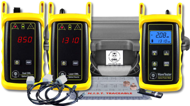 The WaveTester / Dual OWL 850 / Laser OWL 1310 Test Kit contains the tools necessary for certifying fiber optic links against a myriad of popular cabling standards in multimode networks at 850 nm and singlemode networks at 1310 nm. Many fiber optic network bids and Requests For Quote (RFQ) are citing cabling standards to specify the set of guidelines (such as fiber length) that the network installer must follow during the network installation. Adherence to such standards is meant to ensure the quality of the installation and guarantee that the network will perform as it was designed. The process of testing a network installation to ensure its adherence to specified standards is called certification, and often requires hard-copy documentation as proof of adherence to standards. The WaveTester optical power meter is multimode and singlemode ready, and can store reference values for all wavelengths used for optical loss measurements. Up to 200 fiber runs may be stored, and serially downloaded to a PC for report generation using our OWL Reporter software.