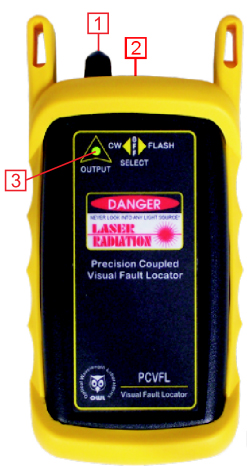 The PCVFL (Precision Coupled Visual Fault Locator) is a light-weight, hand-held tool used to quickly troubleshoot faults in the continuity of both single-mode and multimode fibers, especially at fiber launch points or in OTDR dead zones. A high-intensity visible red laser beam is precision-coupled into a optical fiber; breaks and micro-bends in the fiber deflect the red light into the fiber jacket, producing a red glow at the point of the fault. Additionally, the PCVFL can be used as an end-to-end visual fiber identifier, which is useful for locating fibers terminated in poorly labeled or unlabeled fiber patch panels. A single switch is used to operate the PCVFL, toggling the unit between OFF, CW (continuous wave), and Pulsed modes. Typical battery life in CW mode is 15 hours, and the short 12.5% duty cycle in pulsed mode extends the battery life to 120 hours of continuous use. The PCVFL ships standard with a 2.5mm universal connector port, which allows for connection to ST, SC, and FC connectors. Extreme caution must be exercised when operating the PCVFL. Lasers such as the ones in the PCVFL produce intense beams of laser light that are harmful to the eye. TO ENSURE YOUR SAFETY: NEVER LOOK INTO A LIGHT SOURCE OR THE END OF A FIBER THAT MAY BE ENERGIZED BY A SOURCE! Exposure to such energy can cause serious retina damage, and prolonged exposure can cause blindness.