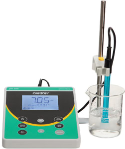The PH 550 benchtop pH meter features a microprocessor chip which provides automatic temperature compensation, data storage, parameter setup, and Max/Min reading display. The meter offers a pH range from 0 to 14 and a three-point automatic calibration, with the ability to recognition standard buffer solutions (USA or NIST series). The advanced digital processing technology improves meter response time and measuring accuracy. A stable reading display mode appears when the measuring value is stable. The 3-in-1 combination pH electrode measures pH and temperature simultaneously. The compact meter includes a detachable electrode holder and three bottles of pH buffer solution. It has a dustproof and spillproof rating of IP54. Connectors are protected by silicone seal caps.