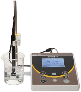 The CON 550 benchtop conductivity meter features a microprocessor chip which provides automatic calibration, automatic temperature compensation, data storage, parameter setup, and Max/Min reading display. The meter reads 0 to 200 mS/cm across four ranges and the four-point conductivity calibration, with automatic solution recognition, makes for easy calibration. The advanced digital processing technology improves meter response time and measuring accuracy. A stable reading display mode appears when the measuring value is stable. A conductivity electrode with temperature sensor measures conductivity and temperature simultaneously and allows for automatic temperature compensation. The compact meter includes a detachable electrode holder and three bottles of conductivity calibration solution. It has a dustproof and spillproof rating of IP54. Connectors are protected by silicone seal caps.