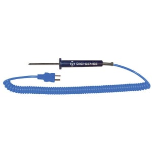 The Oakton Penetration Probes offer a pointed tip style for penetration into hard and semisolid materials. Sturdy stainless steel tip casing prevents tip from bending when inserting. Probes include a 5-ft. PVC coiled cord with strain relief that protects from repeated flexing and tugging. Ergonomic, easy-grip 5"L handle provides maximum heat insulation and impact resistance. Finger stops on handle prevent probe from rolling and fingers from sliding when inserting probe into hard materials. The 316 stainless steel sheath (shaft casing) provides durability, strength, and maximum abrasion resistance. Rugged thermoset plastic mini connector is compatible with all Digi-Sense and Acorn thermocouple thermometer. The 316 stainless steel sheath (shaft casing) provides durability, strength, and maximum abrasion resistance. Rugged thermoset plastic miniconnector is compatible with all Oakton and Acorn thermocouple thermometers. Temperature Range: -418 to 752°F (-250 to 400°C); Dimension: 4.5" tip length, 0.125" diameter.