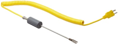 Spear tips make semisolid testing easy; exposed junctions with perforated shields provide fast response to flowing air Probes include a 5-ft PVC coiled cord with strain relief that protects from repeated flexing and tugging. Ergonomic, easy-grip 5"L glass-filled nylon handle (unless noted below) provides maximum heat insulation and impact resistance. Fingerstops on handle prevent probe from rolling and fingers from sliding when inserting probe into hard materials. The 316 stainless steel sheath (shaft casing) provides durability, strength, and maximum abrasion resistance. Rugged thermoset plastic miniconnector is compatible with all Oakton and Acorn ® thermocouple thermometers. Connectors and coiled cord are color-coded based on thermocouple type: type J black, type K yellow, and type T blue.