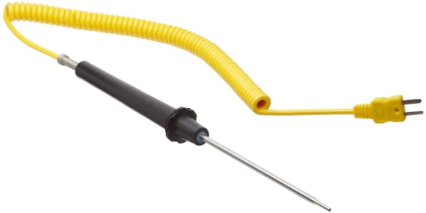 Stainless steel sheaths provide good chemical resistance and fast thermal response These thermocouple probes were designed to measure any general-purpose or liquid immersion application. All thermocouple probes include a 5-ft PVC coiled cord with strain relief that protects from repeated flexing and tugging. Ergonomic, easy-grip 5"L glass-filled nylon handle (unless noted below) provides maximum heat insulation and impact resistance. Fingerstops on handle prevent probe from rolling and fingers from sliding when inserting probe into hard materials.