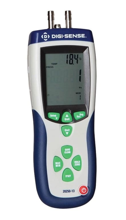 The Digi-Sense pressure and flow meter is designed to measure differential and static pressure, and calculate air velocity and airflow in ductwork. Ideal for evaluating of duct performance and proper airflow, air filter monitoring, adjusting motor speeds in HVAC systems, and ensuring safe working conditions in buildings and schools. Plus the NIST-traceable pre-calibration means you get reliable measurements right out of the box, saving you time and money!