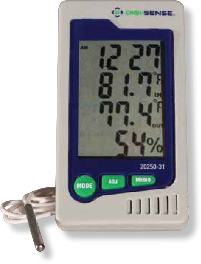 Designed to gauge proper humidity levels. Assess comfort level of your environment with unique comfort indicator symbol that displays comfortable, wet (high humidity), or dry (low humidity). Read temperature, humidity, and time on easy-viewing digital thermohygrometer display. The Digi-Sense Thermohygrometer Indicators are designed to display temperature, humidity and time. The unique environment comfort indicator lets the user know how the level of humidity is affecting comfort, to high, low or ideal. Advanced features include °F/°C unit selection, min/max reading for temperature and humidity, environment comfort indicator, clock with alarm and date. Plus the NIST-traceable precalibration means you get reliable measurements right out of the box, saving you time and money. Model 20250-31 has built-in temperature and humidly sensors for indoor measurements and an external temperature probe for remote monitoring of indoor or outdoor applications.