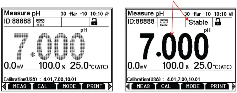 FAST: The Stable indicator will appear quickest of any setting. If you find that the Stable indicator frequently appears and disappears, you may want to select a slower setting. This setting is not recommended when AUTO READ is enabled. It is also not suitable for most non-refillable electrodes which are generally slower to respond.
