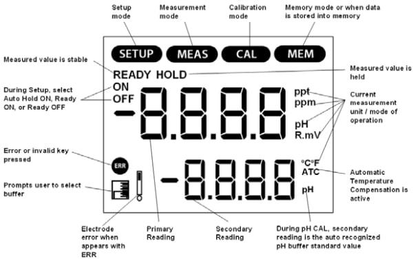 - Oversized dual display for easier viewing - LCD shows measured parameter and temperature in pH/mV modes; ion concentration and mV (electrode output) in ion mode