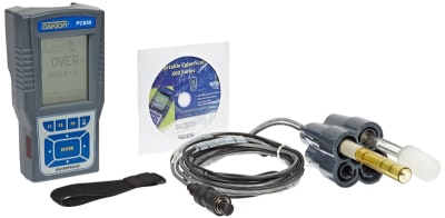 The Oakton PC 650 pH/conductivity meter is a multi-parameter, handheld, waterproof and dustproof meter kit. The meter is commonly used to measure pH, conductivity, temperature, Total Dissolved Solids (TDS), and mV of a substance. The PC 650 features ATC, with pH calibration up to six points, and up to 15 auto-buffer options. It has recognition of USA, National Institute of Standards and Technology (NIST), Deutsches Institut für Normung (DIN) and PWB standards, for ease of use. It has a large, backlit LCD screen to provide ease of viewing, and to display indicators. The meter has an adjustable alarm to remind you when calibration is due. It stores up to 500 data sets, and has IrDA wireless technology for data communication. The meter has a built-in, real time clock with time and date stamping and set-point alarms, and a built-in stand. It comes with an electrode status indicator and password protection.