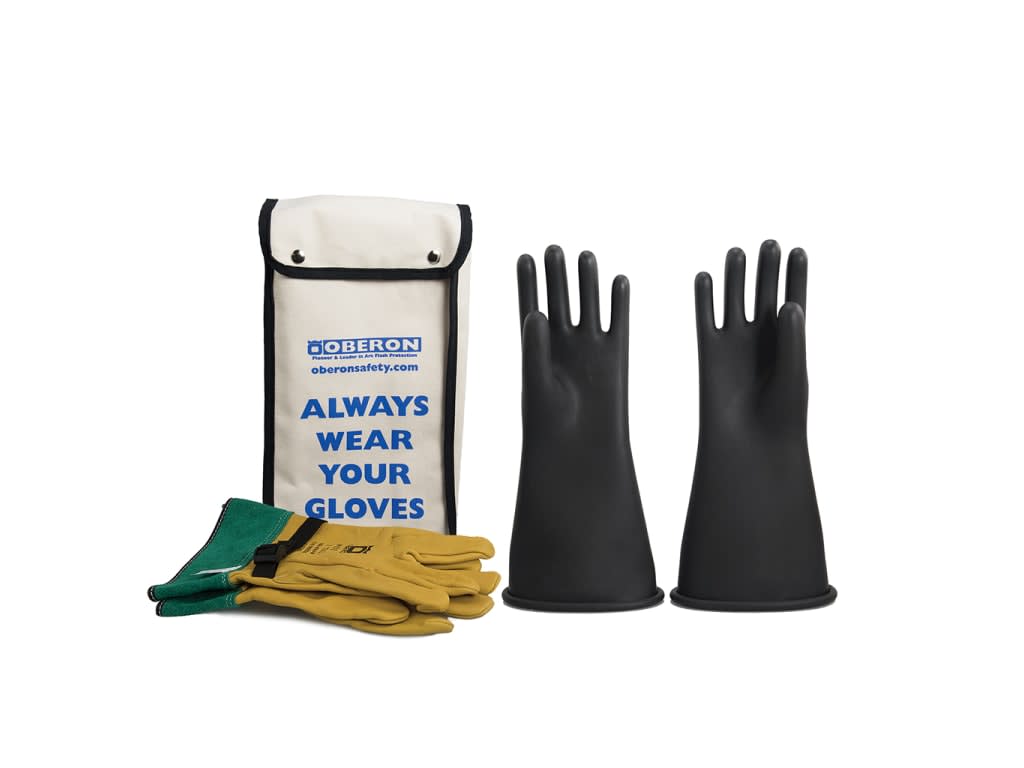 The Oberon GLVKT Rubber Electrical Glove Kits are designed and constructed to act as a barrier between the user and the energy/voltage, to insulate the user from electric shock. The ASTM D120 standard outlines the protection that the glove provides. The rubber gloves are thicker as their protection increases. The rubber gloves will provide protection against either Alternating Current (AC) as well as Direct Current (DC), up to the levels detailed in the standard as well as typically on the labeling, which is required to be affixed to each glove. It is important NOT to exceed the USE voltage detailed to avoid injury.