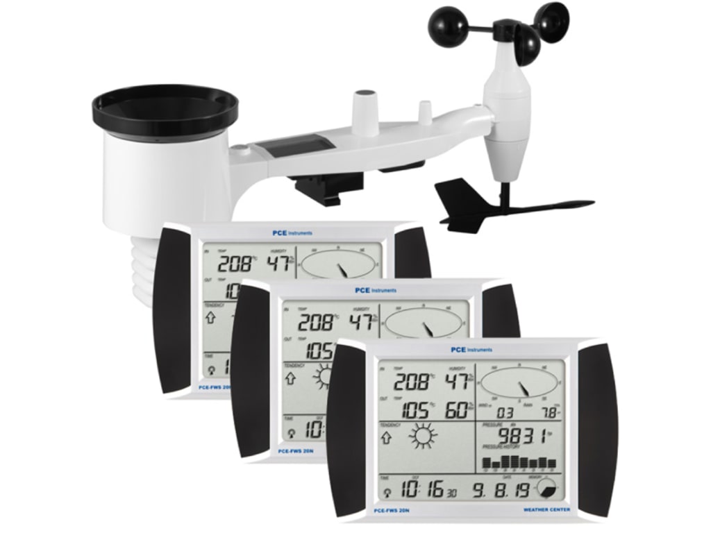 Radio climate meter to determine the wind direction, wind speed, temperature, relative humidity and rainfall / Adjustable alarm functions / USB interface / Analysis software / Solar module and batteries for powering the transmitter / Transmission frequency: 868 MHz
