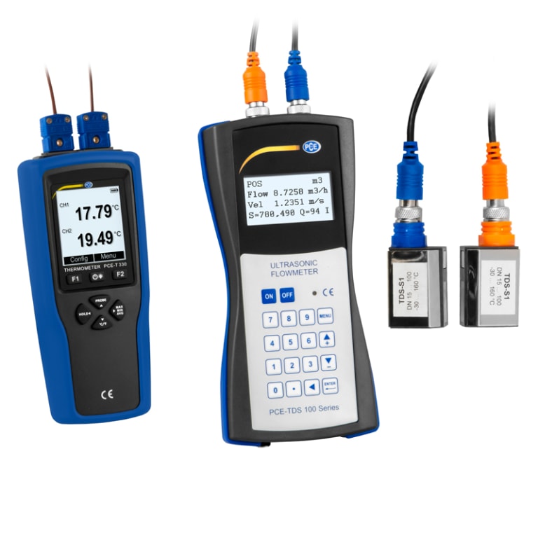 The PCE-TDS 100HS+ is an ultrasonic flow meter that measures liquid flow velocity in pipes and tubes with a diameter of 20 to 108 mm, or approximately 3/4 to 4 inches. This version comes with a two-channel temperature data logger. The portable, handheld, clamp-on sensor flow meter provides non-invasive, unobstructed, and highly accurate measurements of the flow velocity of liquids in metal, plastic, and rubber pipes. The user-friendly Velcro-strap clamps allow for quick and easy repositioning of the electroacoustic transducers.