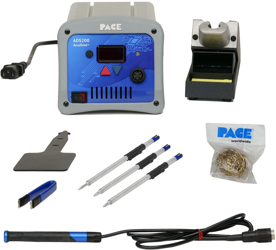 PACE’s ADS200 is a high power (up to 120 Watts), yet low-cost professional soldering station for serious cell-phone repairers, electronics techs, engineers, DIYers & production solder techs. It features the groundbreaking TD-200 Tip-Heater Cartridge Soldering Iron, with its sleek and ergonomic aluminum handle designed to stay cool and comfortable during continuous production soldering. Blue Series Tip-Heater Cartridges integrate a high accuracy sensor with a robust heater, delivering up to 120 Watts of pure power. Three of PACE's most popular Tip Heater Cartridges are included. At the heart of the ADS200 lies PACE’s new AccuDrive temperature control technology, which delivers unsurpassed thermal performance and highly accurate temperatures, without the need to change tip cartridges or calibrate. Its advanced electronics provide instantaneous load sensing and on-demand power to quickly reflow solder joints at the lowest, safest temperature required, regardless of the mass of the application. Intended for extreme, multi-shift production use, the ADS200 features a rugged, all-metal design, including housing, soldering iron and tool stand. The system is intuitive and easy to operate - just power it on, set the temperature with arrow keys and start soldering. No training required.