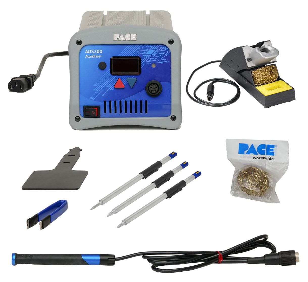PACE’s ADS200 is a high power (up to 120 Watts), yet low-cost professional soldering station for serious cell-phone repairers, electronics techs, engineers, DIYers & production solder techs. It features the groundbreaking TD-200 Tip-Heater Cartridge Soldering Iron, with its sleek and ergonomic aluminum handle designed to stay cool and comfortable during continuous production soldering. An Instant Setback (ISB) Tool Stand is included which automatically lowers the temperature when the TD-200 is placed in the stand, greatly increasing tip life as well as saving energy. Blue Series Tip-Heater Cartridges integrate a high accuracy sensor with a robust heater, delivering up to 120 Watts of pure power. At the heart of the ADS200 lies PACE’s new AccuDrive temperature control technology, which delivers unsurpassed thermal performance and highly accurate temperatures, without the need to change tip cartridges or calibrate. Its advanced electronics provide instantaneous load sensing and on-demand power to quickly reflow solder joints at the lowest, safest temperature required, regardless of the mass of the application. Intended for extreme, multi-shift production use, the ADS200 features a rugged, all-metal design, including housing, soldering iron and tool stand. The system is intuitive and easy to operate - just power it on, set the temperature with arrow keys and start soldering. No training required.