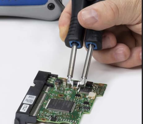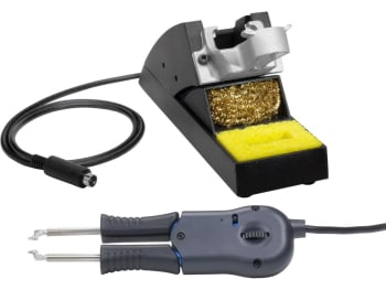 PACE's new MT-200 MiniTweez is a precision thermal tweezer designed to rework micro-components such as 0201s, 0402s and 0603s in a simple, one-handed operation. In the case of 0201s, perfectly aligned tips are critical for success, and the MT-200 has been engineered for multi-axis tip alignment and rotational (theta) alignment that provides ultimate control and targeting accuracy. A Tip-Gap Adjustment Wheel adjusts the gap between the tips to reduce the distance from tip-end to tip-end, reducing grip stress and lessening operator fatigue during repetitive operations. In addition, the MT-200 can also provide safe, rapid removal of much larger chips, SOTs, D-PAKs, SOICs and TSOPs. Designed exclusively for PACE’s AccuDrive power sources, the MT-200 uses patented, higher powered Blue-Series Tip-Heater Cartridges that can be changed within seconds, heat up quickly, provide up to 120 Watts of power per tip pair, yet cost almost half of other competitive tweezer cartridges. Two versions available The MT-200 sold in two configurations - the handpiece can be purchased either on its own with no accessories. It can also be purchased as a kit with a tip and the Instant Set Back stand. The Instant Set Back stand automatically reduces the temperature when the tool is placed back in the stand, helping to extend tip life.