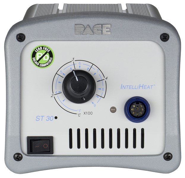 The ST 30 is a single channel system with dial control featuring IntelliHeat®. The system is packaged with the TD-100 ThermoDrive Soldering Iron or can be purchased as a Power Source only and combined with any of 4 optional handpieces. The ST 30 improves quality, reduces costs and eliminates the maintenance and calibration hassles associated with other systems.
