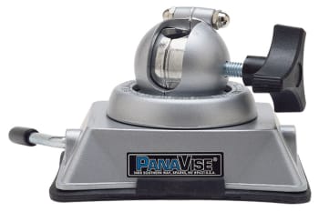 The Panavise 380 is a rubber bottom vise base which can be attached to surfaces with a lever activated vacuum. The 380 is ideal for creating a portable work holding tool. The 380 accepts all 300 series Heads and any 5/8" diameter shaft, and can be attached to any smooth, non-porous flat surface. The Panavise 380 head is compatible with a variety of heads and accessories. Please see the 300 Series Compatibility Chart in the Documents section of this page for more information.