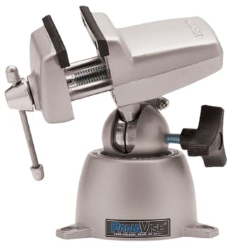 The Panavise 301 is the original PanaVise known around the world. Ideal as a work holding tool for hobbies, electronics, small home repairs and work bench environments, it features an easy-to-use single knob control for head movement through 3-planes: 90° Tilt, 360° Turn & 360° Rotation. Jaws on the PanaVise 301 are 2.5" wide, 0.5" tall and open to 2.25" (57.1mm). Its nylon jaws offer excellent electrical insulation and gentle holding power, with continuous heat tolerance up to 200°F (93°C), and intermittent heat to 300°F (149°C)]. For maximum versatility, the PanaVise 301 base accepts all 300 series Heads and any 5/8" (15.9mm) diameter post. Please see the 300 Series Compatibility Chart in the Documents section of this page for more information.