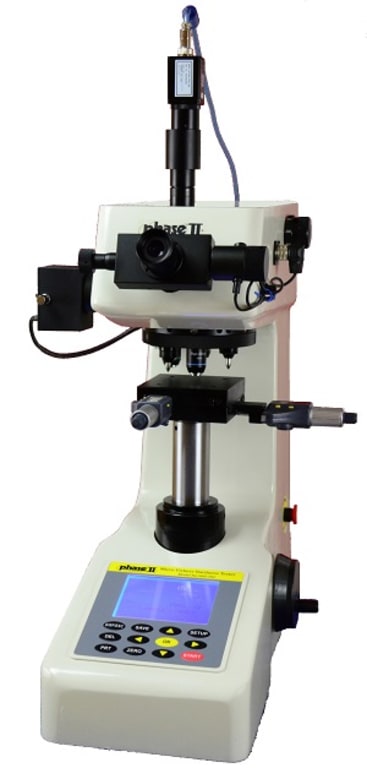The Phase II micro-vickers hardness testers are versatile and user-friendly systems designed for the accurate hardness testing of small precision parts, thin materials, coatings, wires, and case depth determinations. The Phase II 900-392 Series micro-vickers hardness testers include Auto-Turrett, Video Cam, Adapter, USB Output Cable, and a choice of 6-variants of Measurement software, giving you the capabilities of machines that cost thousands more. The 900-392 Micro Vickers hardness tester covers the load range from 10g to 1kg.
