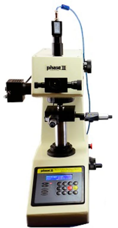 The Phase II+ 900-505 Fully Automated Micro Vickers Hardness Tester is the latest in Vickers hardness tester technology with a completely programmable controller, allowing for automatic X, Y & Z axis precision control. Just program your test patterns and path and walk away. Full reporting and output come standard with the latest Phase II Vickers hardness tester offers.