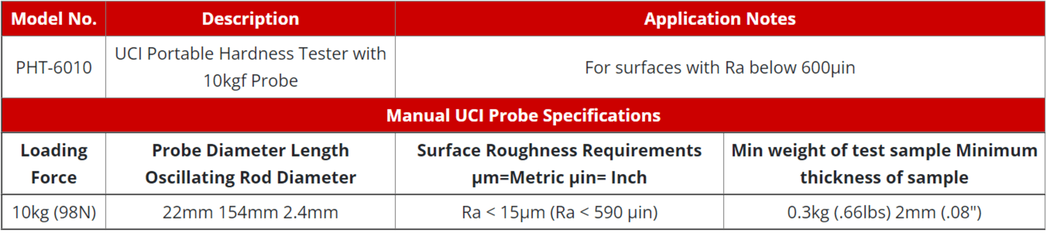 "Ultrasonic Contact Impedance" is based on a 136-degree diamond at the end of a vibrating rod being depressed into the test surface at a fixed load. The difference in Ultrasonic vibration frequency is then calculated into a hardness value. The UCI portable hardness tester procedure is slower than the Dynamic Impact style, however, the "UCI" method of hardness testing is portable, easy and accurate. It also has its own advantages when utilized for certain testing applications. UCI portable hardness testers are not restricted to large mass items like dynamic type testers. These portable hardness testers can test metals as thin as 2mm and at a hardness value as low as 20HRC (75HB). They also excel at performing hardness tests on larger, harder metals as well. Another reason for the rise in popularity is due to the fact that the UCI method is categorized as "Non-Destructive". That translates into less scrap parts/ lower mfg costs due to necessary inspections.